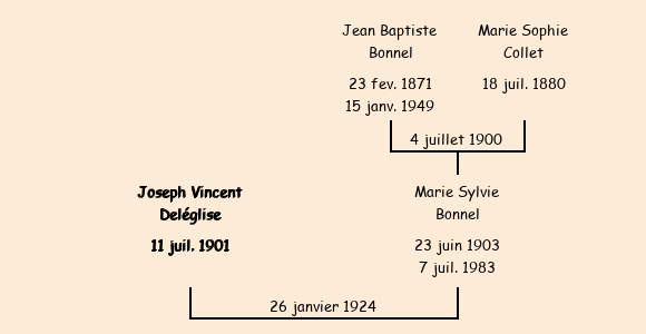 Epouse : Marie Sylvie Bonnel (20 ans, née le 23 juin1903, de La Bise), fille de Jean Baptiste et de Marie Sophie Collet |