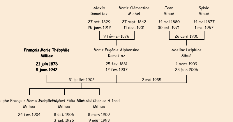 Epoux : François Marie Théophile Joseph Milliex (26 ans, né le 21 juin1876 à Saint Sorlin d'Arves où il habite), fils de Pierre Jacques et de Marie Justine Didier (décédée à Saint Sorlin d'Arves le 12 février1882) |