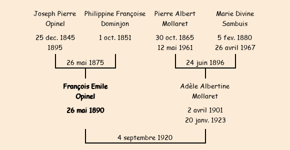 Epoux : François Emile Opinel (forgeron né à Albiez le Vieux le 26 mai1890, domicilié à Gévoudaz), fils de feu Joseph et de feue Françoise Dominjon |