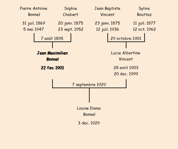 Epoux : Jean Maximilien Bonnel (28 ans, né à Albiez le Vieux le 22 février1901, domicilié à Saint Jean de Maurienne rue du Collège, manoeuvre), fils de Pierre Antoine (domicilié à Saint Jean de Maurienne) et de Sophie Chabert |