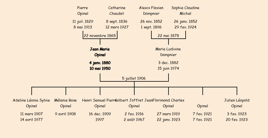 Epoux : Jean Marie Opinel (26 ans, né le 4 janvier 1880 à Albiez le Vieux, coutelier), fils de Pierre (76 ans, coutelier) et de Catherine Chaudet (66 ans, de Gévoudaz hameau d'Albiez le Vieux) |