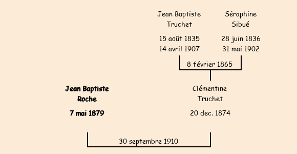 Epoux : Jean Baptiste Roche (31 ans, né le 7 mai1879 et domicilié à Villarembert), fils de Félix (décédé à la Rochette le 3 septembre1890) et de Françoise Roche |