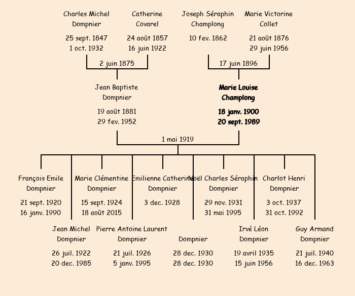 Epoux : Jean Baptiste Dompnier (né à Fontcouverte lel 19 août1881, domicilié à La Maison Blance, veuf de Marie Clémentine Collet), fils de Charles (de La Maison Blanche) et de Catherine Covarel (de La Maison Blanche) |