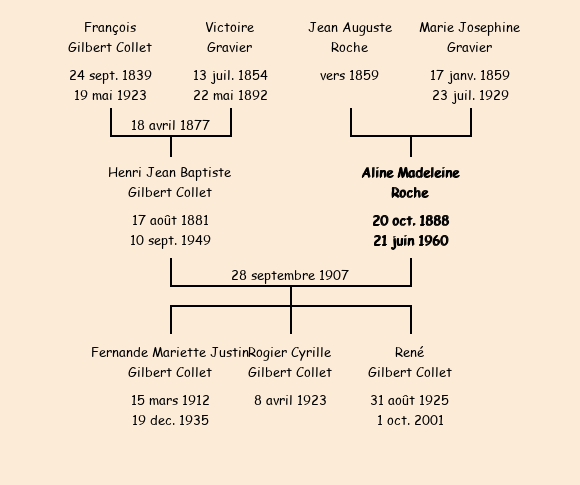 Epoux : Irénée Jean Baptiste Gilbert Collet (26 ans, né à L'Alpettaz le 17 août1881), fils de François (68 ans) et de Victorine Gravier (décédée à l'Alpettaz le 22 mai1892) |