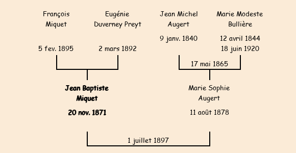 Epouse : Marie Sophie Augert (18 ans, née le 11 août1878, du Villard, cultivatrice, a signé), fille de Jean Michel (cultivateur au Villard, a signé) et de Marie Modeste Bullière (cultivatrice, n'a pas su signer) |
