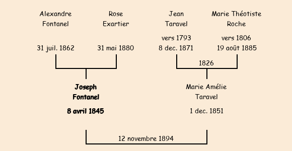 Epoux : Joseph Fontanel (49 ans, né le 8 avril1845 à Albiez le Jeune, cultivateur à Albiez le Jeune, a signé), fils de Alexandre (décédé le 31 juillet1862 à Albiez le Jeune) et de Rose Exartier (décédée le 31 mai1880 à Albiez le Jeune) |