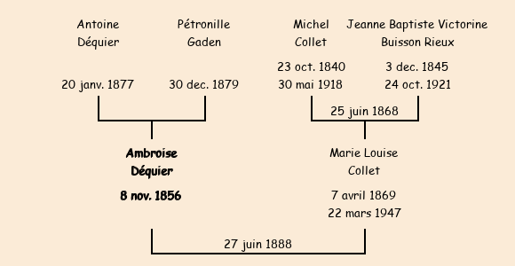 Epoux : Ambroise Déquier (32 ans, né à Fontcouverte le 8 novembre1856, cultivateur à Jarrier, a signé), fils de Antoine (décédé à Jarrier le 20 janvier 1877) et de Pétronille Gaden (décédée le 30 décembre1879 à Jarrier) |