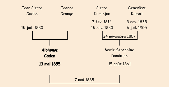 Epoux : Alphonse Gaden (30 ans, né le 13 mai1855 à Jarrier, cultivateur à Jarrier, a signé), fils de Jean Pierre (décédé le 15 juillet1880 à Jarrier) et de Jeanne Grange (ménagère, domiciliée à Jarrier, n'a pas signé) |