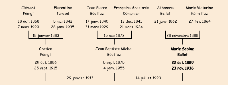 Epoux : Jean Baptiste Michel Bouttaz (44 ans, né à Fontcouverte le 5 septembre1875, domicilié à Tillerèche, veuf de Collet Marie Elise), fils de Jean Pierre et de Françoise Anasthasie Dompnier |