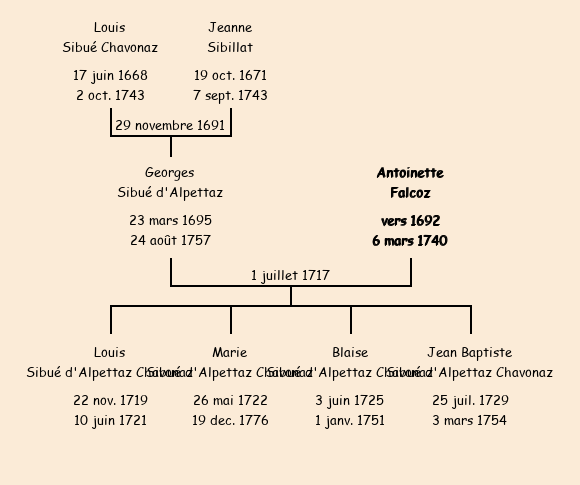 Epouse : Antoinette Falcoz (de Valloire), fille de Antoine |