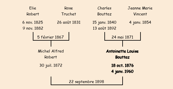 Mariée (21 ans) avec Michel Alfred Robert (26 ans) le 22 septembre 1898 à Saint-Jean-de-Maurienne |