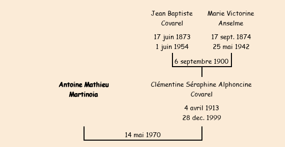 | Marié avec Clémentine Séraphine Alphoncine Covarel (57 ans) le 14 mai 1970 à Saint-Jean-de-Maurienne |