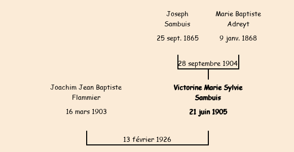 Epouse : Victorine Marie Sylvie Sambuis (20 ans, née à Albiez le Vieux le 21 juin1905, domiciliée à Fontcouverte), fille de feu Joseph et de Marie Baptiste Adrait |