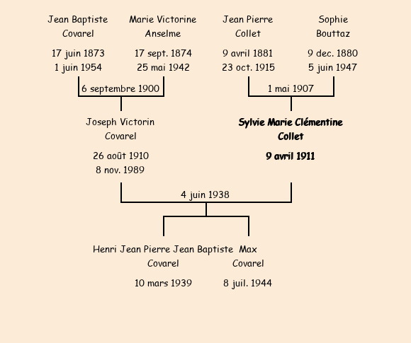 Epouse : Sylvie Marie Clémentine Collet (27 ans, née à Saint Pancrace le 9 avril1911, domiciliée aux Anselmes), fille de feu Jean Pierre et de Sophie Bouttaz |