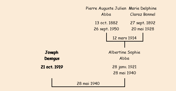 Epouse : Albertine Sophie Abba (19 ans, née à Fontcouverte le 28 janvier 1921, du Suel), fille de Pierre Auguste Julien et de Marie Delphine Claraz Bonnel |