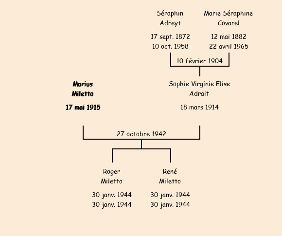 Epouse : Sophie Virginie Elise Adrait (née le 18 mars1914 à Fontcouverte, de La Rochette), fille de Séraphin (de Vers le Rieux) et de Marie Séraphine Covarel |