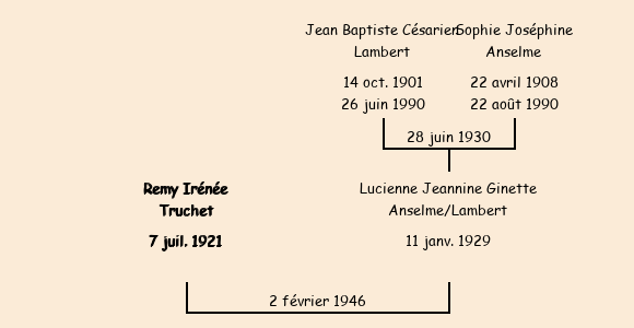 Epoux : Remy Irénée Truchet (24 ans, né à Saint Jean de Maurienne le 7 juillet1921, domicilié à La Combre quartier de Saint Jean de Maurienne), fils de Emile Gustave (employé aux Plâtrières du Sud Est) et de Francisca Cornu (domiciliés à Saint Jean de Maurienne) |