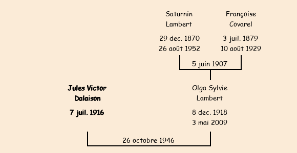 Epoux : Jules Victor Dalaison (30 ans, né à Sollières Sardières le 7 juillet1916, domicilié à Sain Jean de Maurienne rue du Collège, boucher), fils de Hippolyte et de Louise Couvert (domiciliés à Sollières Sardières) |