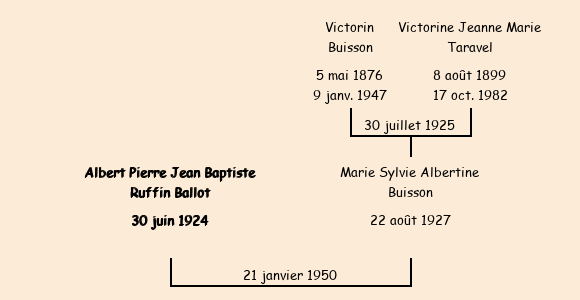 Epouse : Marie Sylvie Albertine Buisson (22 ans, née à Fontcouverte le 22 août1927, du Roset Dessus), fille de feu Victorin et de Jeanne Marie Taravel |