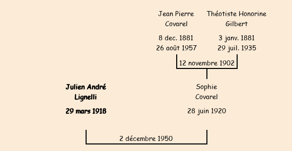 Epoux : Julien André Lignelli (32 ans, né à Nice le 29 mars1918, domicilié à Nice, 44 avenue Cyrille Besse, industriel), fils de feu Sauveur et de Caroline Povero (couturière) |