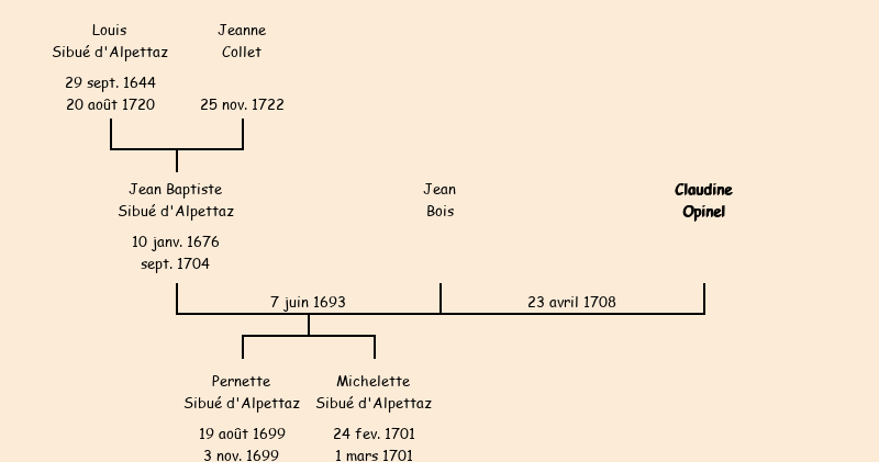 Epouse : Claudine Opinel (d'Albiez le Vieux, veuve de Jean Baptiste Sibué d'Alpettaz fils de Louis décédé fin septembre 1704 à l'hopital du Saint Esprit de Toulon, soldat de la Légion de Savoie, prisonnier), fille de feu Félix |