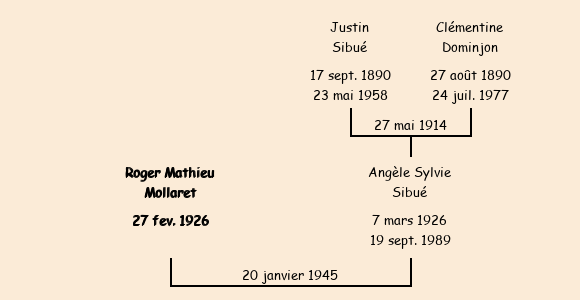Epouse : Angèle Sylvie Sibué (18 ans, née à Fontcouverte le 7 mars1926, de Pierrepin Dessous), fille de Justin et de Clémentine Dominjon |