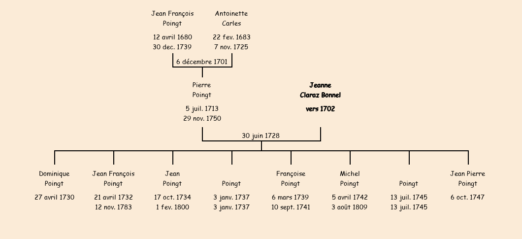 | Jeanne Claraz Bonnel apparait dans le recensement des personnes de Fontcouverte et de leurs bestiaux de 1734. |