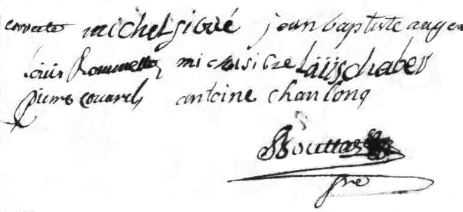 Je Secretaire Soussigné certifie que dans le courant de mois de novembre dernier je me suis transporté chez tous les particuliers de fontcouverte, en l’assistance d’honble pierre Bonnel Sindic de la communauté dud lieu, d’honbles michel Sibué l’ainé, michel Sibué le jeune, Jean Baptiste Augert, pierre Covarel et Louis Chabert … qui m’ont accompagnés alternativement… | d’y avoir exactement pris le denombrement des personnes et bestiaux la composent suivant lequel lesdis particuliers doivent lever cette année quinze mille Sept Cent Soixante deux livres de sel, en foy de quoi j’ai signé. foncouverte le 16e Xbre 1789 ![]() | |||||||||||||||||||||||||