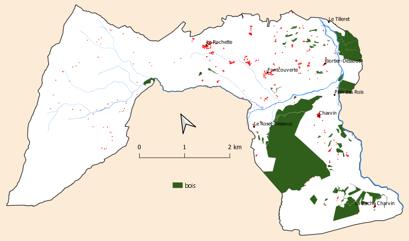 Les deux parcelles (7985 et 7986) de haute futaie en bordure de la grande parcelle forestière de la branche de droite ne représentent qu’un quart d’hectare. Mais les grandes parcelles de bois comme celle au centre de la branche de droite, celles à La Roche Charvin et celles des gorges de l’Arvan près du Tilleret sont cataloguées comme « bois » sans plus de précisions. Les parcelles de la rive droite de l'Arvan à l'extrémité est de la branche transversale sont en fait la couverture partielle des falaises schisteuses et mal définies en parcelles (incultes pour certaines parties, bois pour d'autres suivant la hauteur d'observation du versant rocheux ou l'humeur de l'estimateur d'office).