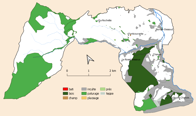 Dans la branche de droite, les nombreux communaux manifestent la mauvaise qualité générale des terres assurant seulement une couverture de forêt et une importante extension des parcelles rocheuses pratiquement incultes. Seules les pentes du Mont Charvin supportent quelques pâturages liés à l'altitude.