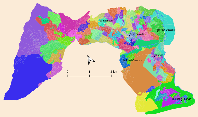 Le toponyme de la Perrière de Charvin présente un centre bien circonscrit mais diverses parcelles sont dispersées à une certaine distance au milieu d’autres toponymes. Manifestement, le lieu‑dit souffre d’une certaine imprécision. Le toponyme des Pales présente la même dispersion ce qui confirme la difficulté des indicateurs à situer les limites des lieux‑dits.