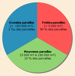 Les grandes parcelles dont la surface dépasse 150 000 m2 (15 hectares) sont réduites à une dizaine seulement (soit 1 pour mille en nombre des parcelles).