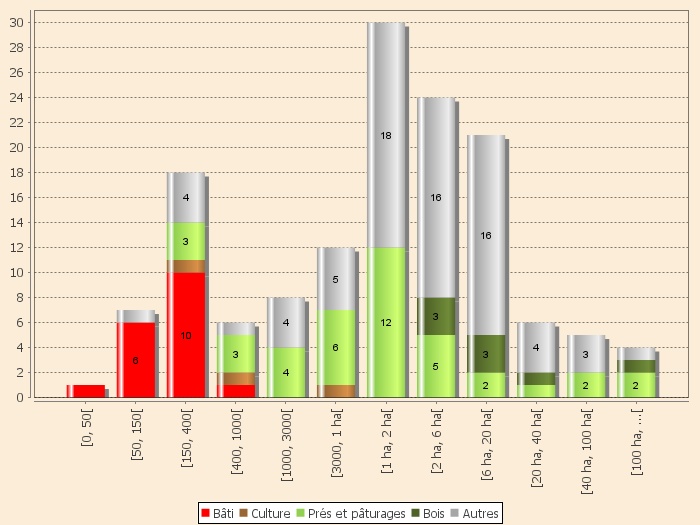 On traite ici les nombres des parcelles. Une analyse plus détaillée que la précédente peut être faite des parcelles de la paroisse en classant les parcelles suivant leurs surfaces.