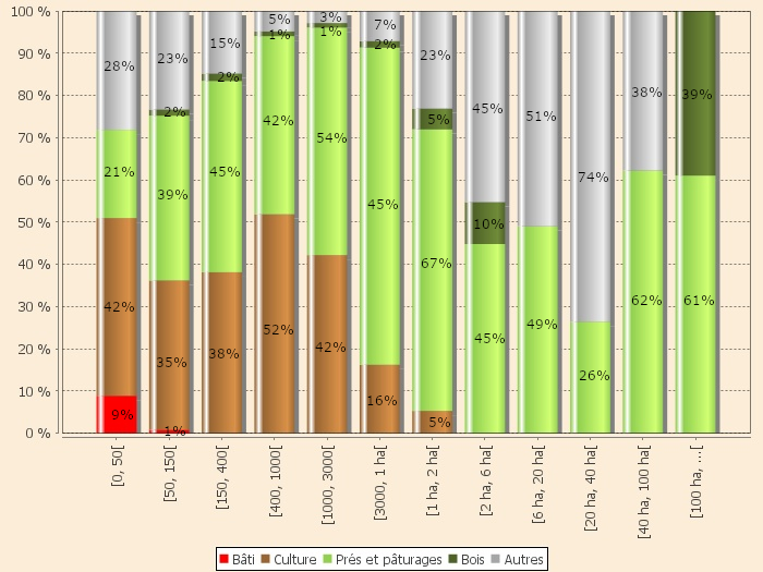 Les cultures couvrent approximativement 40 à 50 % des surfaces dans les parcelles de moins de 3 000 m2 et disparaissent progressivement dans celles comprises entre 3 000 m2 et 2 hectares. Les prés‑pâturages représentent une proportion de surface régulièrement croissante de 20 % à 100 % avec quelques bois et terrains incultes en proportions mineures.