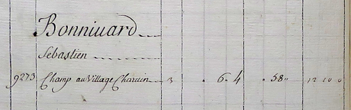 Le nom du propriétaire est Bonnivard Sébastien dont la propriété est exceptionnellement réduite puisqu’elle ne comprend que la parcelle 9273. Malgré ces indications claires, il nous est cependant impossible de savoir qui est ce Sébastien puisque, en l’absence de précisions sur l’identité du propriétaire, nous ne pouvons le reconnaitre parmi les trois Sébastien Bonnivard que nous connaissons dans la paroisse vivant en 1730.