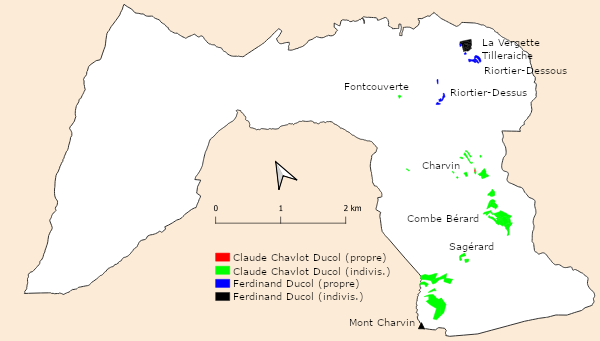Claude Ferdinand Ducol (la tabelle ne précise pas le prénom de son père) possède de son côté une propriété en propre de 13 parcelles soit 5 champs, 6 prés, 1 paturage et une broussaille, à La Bise et Riortier‑Dessous. Avec ses frères, il partage en indivision totale une seconde propriété regroupant 1 maison, 4 champs, 2 prés, 1 vigne, 1 bois, 1 broussaille et une parcelle de rocher soit 11 parcelles, toutes jointives, près de Tilleraiche (et non Tilleray comme l'écrit la tabelle, susceptible de confusion avec le village voisin du Tilleret).