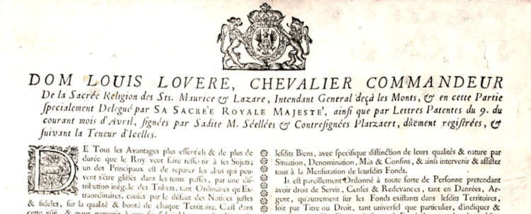 Lorsque est déclenchée, par lettre patente du 9 avril 1728, la cadastration du Duché de Savoie, le Roi peut s’appuyer sur l’expérience acquise de façon récente par les Autrichiens dans le Milanais et par lui‑même dans le Piémont. Il peut se servir de sa propre nature rigoureuse pour définir les buts, les méthodes et les moyens à mettre en œuvre ce qui donne lieu à l'émission de documents définissant une organisation très structurée et de consignes d’exécution précises.
