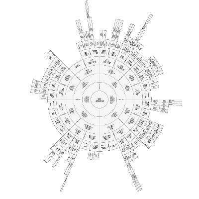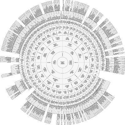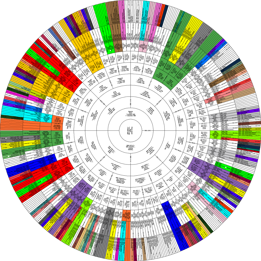 Une solution graphique moins esthétique que celle de l’arbre pallie, au moins en partie, les inconvénients des deux représentations précédentes et tend à remplacer les arbres classiques. Il s’agit des roues des ancêtres.