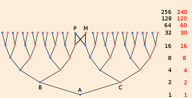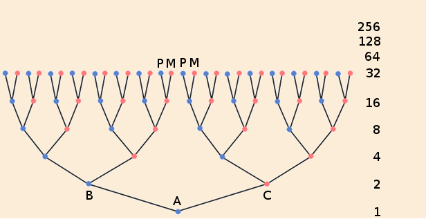 A veut faire son arbre généalogique en regroupant ceux de ses parents B et C que le Curé a dû faire à l’époque de leurs mariages pour s’assurer que ceux-ci sont bien admissibles par le droit canonique. Le graphique précise, à droite et en noir, le nombre d’ancêtres « théoriques » à chaque rang. On note en particulier le nombre de 32 ancêtres au rang 5 mais les générations supérieures à ce rang comporteraient elles‑mêmes 64, 128 et 256 ... ancêtres non représentés ici.