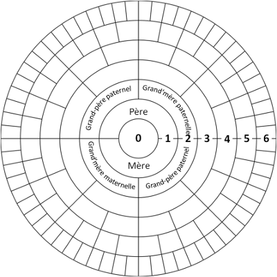 Chaque couronne d’une génération porte un numéro que nous appelons « rang » : 1 pour les parents, 2 pour les grands‑parents …