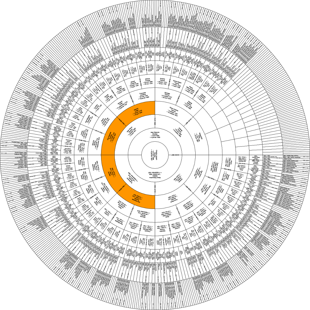 Nous utilisons la représentation généalogique sous la forme de roue, la plus apte à illustrer notre analyse et nous l’appliquons à deux cas en nous limitant, pour des raisons de lisibilité, aux 9 générations précédant celle de la personne au centre de sa roue. Il est rappelé que chaque couronne d’une roue, correspondant à une génération, est précisée par son rang croissant de 1 en 1 à partir de 0 pour la personne centrale.