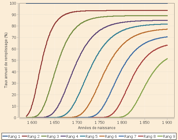 Ce calcul répété sur l’ensemble des roues élaborées pour toutes les personnes identifiées de Fontcouverte, soit 14 308 roues, permet une estimation moyenne des taux de remplissage des couronnes des roues des personnes nées une année civile donnée. Le graphique donne ces taux en fonction de l’année de naissance de la personne au centre de la roue. Ces courbes sont obtenues par lissage des valeurs annuelles observées. La courbe du rang 1 est pratiquement confondue avec le bord supérieur du graphique (les parents des divers Fontouvertins sont très généralement connus).