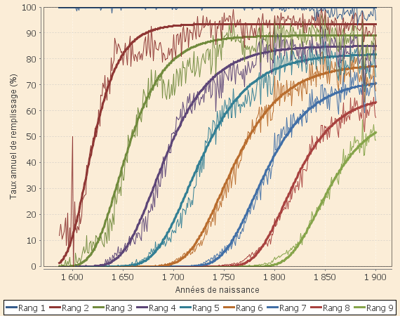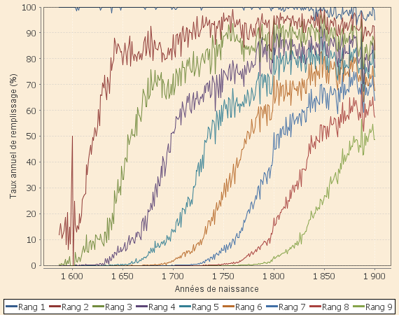 Le graphique donne le taux de remplissage des couronnes successives, définies par leur rang de 1 à 9, des roues réalisées à Fontcouverte pour les personnes nées entre 1587 et 1900. Les taux présentés sont calculés comme la moyenne annuelle des taux correspondants aux personnes nées chaque année civile entre ces dates.