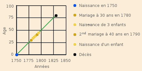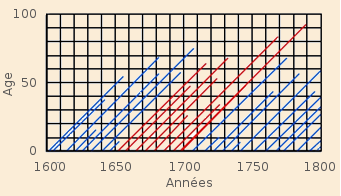 Sur l'axe horizontal sont portées les années du calendrier, sur l'axe vertical les âges. En prenant la même échelle sur les deux axes, la vie d'une personne est matérialisée par la droite à 45° partant de sa date de naissance, soit ici une personne née le 1er janvier 1750.