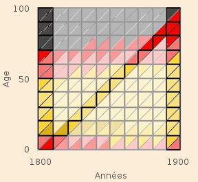 Dans le diagramme de Lexis ci-contre, sont représentées les probabilités des personnes de mourir une année donnée et à un âge donné, les probabilités étant caractérisées par des couleurs différentes (jaune pour une faible probabilité de mourir à noir pour une forte).
