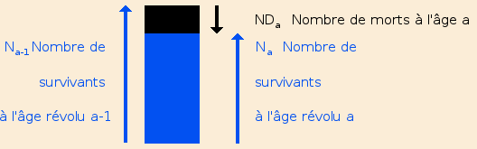 Nous reprenons comme exemple les décès pour définir le quotient de mortalité. La même définition s'applique aux autres quotients utiles en démographie. Le quotient de mortalité à l'âge a, noté qa, se calcule comme le rapport du nombre NDa de personnes mourant entre les âges révolus a-1 et a au nombre de personnes Na ayant atteint l'âge révolu a-1. Le quotient a alors une interprétation très simple : c'est la probabilité (sans parler de chance pour faire moins scientifique !) pour un individu de mourir au cours de sa ae année. Par exemple, un quotient de mortalité à 0 ans de 0,25, en 1625 à Fontcouverte, signifie que le quart des nouveaux nés meurent avant 1 an à cette époque.