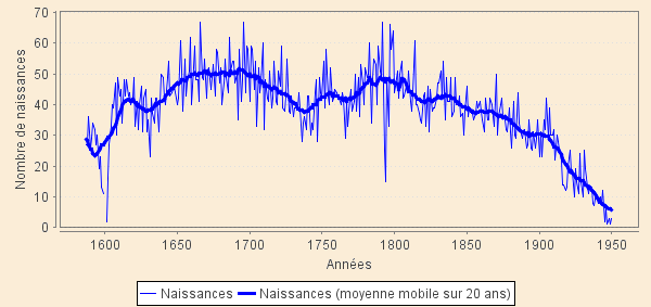 Le graphique ci-dessous présente le nombre annuel des naissances (trait fin) fortement fluctuant et le résultat d'une transformation (trait gras) décrite ci-dessous qui permet de « lisser » les fluctuations rapides de façon à mieux laisser apparaitre les évolution à long terme.