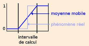 Ce procédé de calcul n'est pas sans défaut si l'on s'intéresse à une variation brusque de la tendance à long terme. Par exemple, si l'on traite un phénomène passant brutalement d'une valeur 0 à une valeur 1, l'échelon qu'il présente sera transformé en une rampe fictive sur l'intervalle qui a servi au calcul de la moyenne mobile. Il importe alors de réduire cet intervalle, au risque d'augmenter la dispersion, pour mieux définir la date exacte de l'échelon.