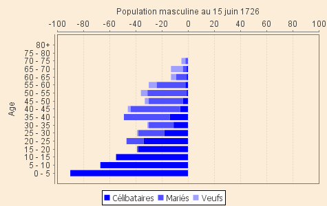 La répartition des émigrants de 1726 en fonction de leur âge à cette date (âge non précisé dans la consigne mais calculable par la structuration de la population) est donnée par la pyramides des âges des seuls hommes (graphique ci-dessous de gauche). Les enfants de moins de 1 an sont dénombrables et supposés ne pas avoir migré. Les présents montrent une répartition pyramidale classique des populations anciennes mais avec une anomalie importante : un déficit net des tranches d'âge principalement marqué entre 15 et 35 ans. Le graphique ci-dessous de droite, portant les absents recensés, montre manifestement qu'il s'agit de l'effet des émigrations.