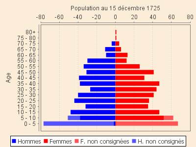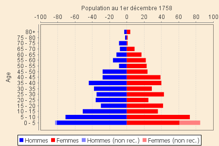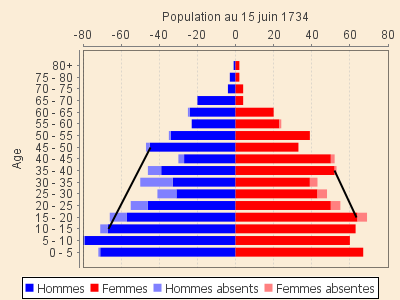 Quoiqu'il en soit, la pyramide de 1759 montre les déficits classiques aux âges intermédiaires qui se poursuivraient, au moins pour les hommes aux âges plus élevés. L'absence de documents immédiatement antérieurs à 1759 ne nous permet pas un jugement correct de ce fait si ce n'est qu'on pourrait admettre une période fortement émigratrice 50 ans avant 1759.
